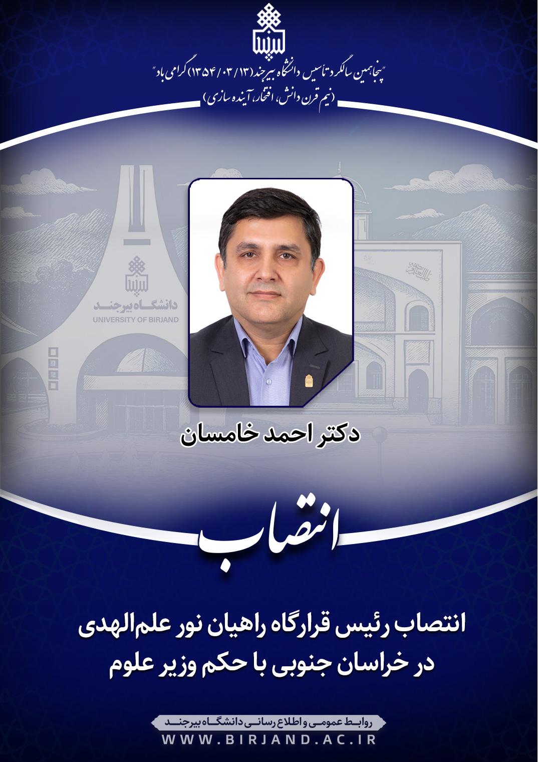 با حکم دکتر حسین سیمایی، وزیر علوم، تحقیقات و فناوری، دکتر احمد خامسان، سرپرست دانشگاه بیرجند به سمت رئیس قرارگاه راهیان نور علم‌الهدی در استان خراسان جنوبی منصوب شد.