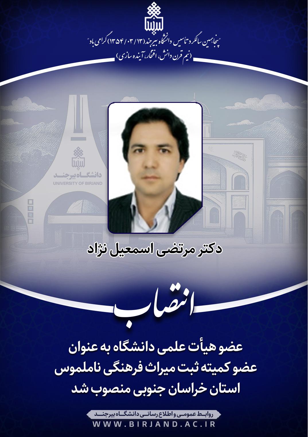 به گزارش روابط عمومی و اطلاعرسانی دانشگاه بیرجند، در ابلاغ صادره از سوی قائم مقام وزیر و معاون وزارت میراث فرهنگی، گردشگری و صنایع دستی، به دکتر اسمعیلنژاد آمده است؛ در راستای تحقق دستورالعمل اجرایی ثبت آثار ملی موضوع ابلاغیه ۹۸۲۱۰۰/۲۲۰۸۹ مورخ ۱۳۹۸/۷/۹ در خصوص تشکیل کمیته ثبت میراث فرهنگی ناملموس استانها نظر به جایگاه حقیقی شما، بدینوسیله برای مدت ۲ سال از تاریخ این ابلاغ(شهریورماه 1404) به عنوان عضو کمیته ثبت میراث فرهنگی ناملموس استان خراسان جنوبی" منصوب می شوید.