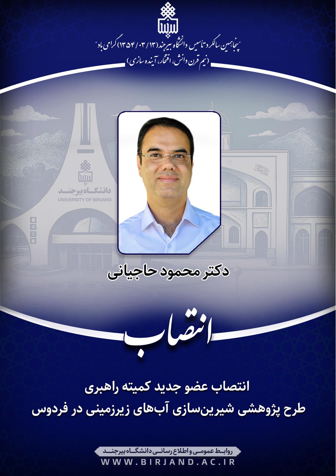 به گزارش روابط عمومی و اطلاع‌رسانی دانشگاه بیرجند، طی حکمی از سوی مهندس عباس سارانی، رئیس هیئت مدیره و مدیرعامل شرکت آب منطقه‌ای خراسان جنوبی، دکتر محمود حاجیانی به عضویت کمیته راهبری پروژه پژوهشی «تعیین روش بهینه شیرین‌سازی آب‌های زیرزمینی نامتعارف به منظور تأمین آب شرب مطالعه موردی شهرستان فردوس» منصوب گردید.