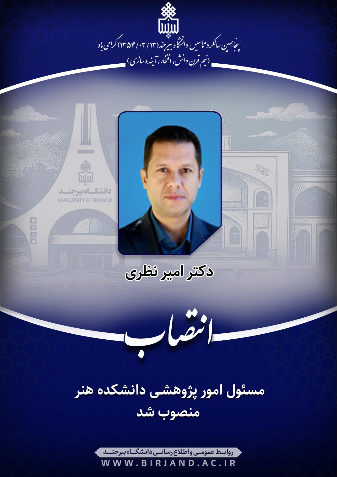 طی ابلاغی از سوی دکتر احمد خامسان، سرپرست دانشگاه بیرجند، دکتر امیر نظری، عضو هیأت علمی گروه آموزشی صنایع دستی  به مدت 2 سال به عنوان مسئول امور پژوهشـی دانشکده هنر منصوب شد