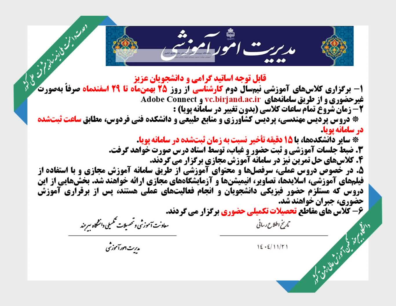 vc.birjand.ac.ir و Adobe Connect برگزار می‌شود.